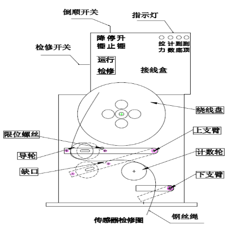 **后檢查一下導輪、計數輪轉動是否靈活,上支臂水平時,缺口要和限位螺絲剛好吻合。檢修完畢,將“倒順開關”撥到“升錘”,繞線盤順時針旋轉,直到重錘上升到頂部,電機會自動斷電,此時將“倒順開關”撥回中間“停”,再將“檢修開關”撥到“運行”,蓋上外殼。