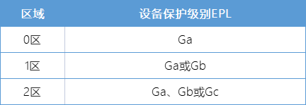 根據(jù)危險場所分類,防爆區(qū)域與適用的設(shè)備保護級別EPL關(guān)系如下: